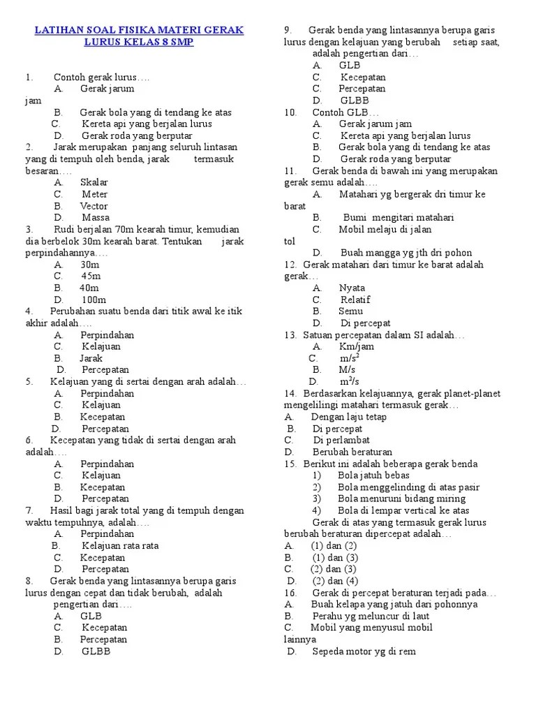 Seratusinstitutedotcom #sinotifonlinedotcom #salam100 #mencerdaskanbangsagerak di dalam ilmu fisika didefinisikan sebagai perubahan tempat . Kali ini soal dan pembahasan fisika kelas 8 smp. Soal gerak benda dan makhluk hidup materi ipa kelas 8 smp kurikulum 2013. Pada kesempatan kali ini, saya akan memberikan contoh latihan soal fisika untuk kelas 8 semester 1 lebih tepatnya materi gerak lurus, . Latihan soal fisika materi gerak lurus kelas 8 smp 1.